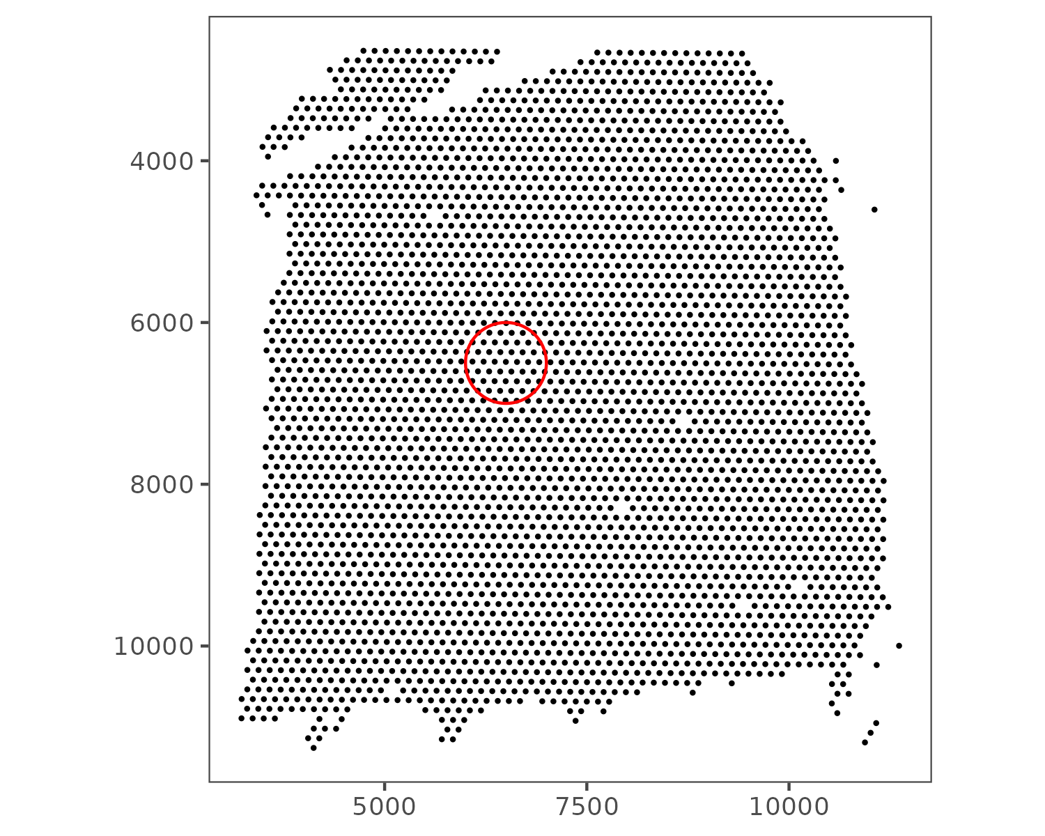 Next, we calculate the distance between spots and apply spatial smoothing. The gene expression of each processed spot is computed as the average of all spots within a circular neighborhood with radius r. In this example, we use r = 500. The figure below illustrates the size of this radius: